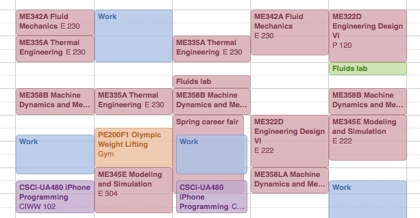 At NYU, class sections tended to follow patterns in their scheduling. They would meet either Monday/Wednesday or Tuesday/Thursday, for the same 75 minute time period each day. Recitations and labs could meet later in the day, or on Friday, and there were plenty of choices for all. My transfer to Stevens was what taught me that I had been taking this sanity for granted; schedule chaos reigned supreme across the Hudson river in Hoboken, and for reasons still unclear…