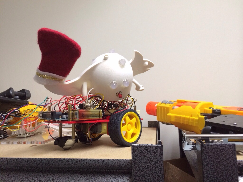 Our mechatronics platform is called PIC-a-Color ChameLeon, or Leon for short. Leon imitates a chameleon in nature by changing his color in order to match his surroundings and fool predators. Leon has two DC motors that allow him to move around in addition to a color sensor and LEDs that allow him to sense and display colors. His phototransistor and push-buttons enable him to sense imminent danger. His body is 3D printed out of ABS plastic, and it is mounted on a basic chassis powered by his motors. Leon is programmed and controlled via an Arduino Uno.